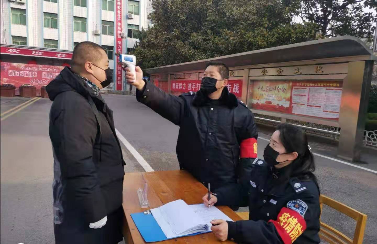 “您好,請(qǐng)停下車(chē),配合測(cè)量體溫,進(jìn)行登記?!眱擅溲b保衛(wèi)部執(zhí)勤人員嚴(yán)肅而又彬彬有禮地說(shuō)道。接著,按照規(guī)定程序完成了疫情防控期間的各項(xiàng)排查工作流程。