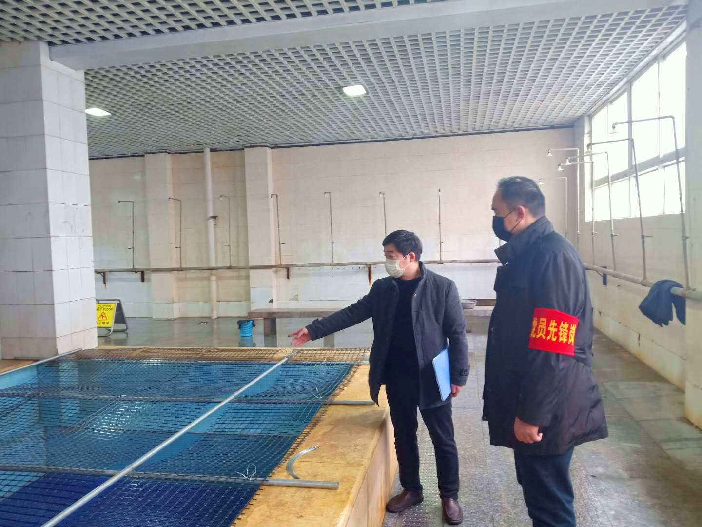 職工更衣室暖氣和空調(diào)24小時開放,平均溫度19℃以上。為保持浴室內(nèi)的溫度,防止職工著涼,浴池上面覆蓋防護網(wǎng),正常放熱水,浴室溫度達到20℃以上,既起到保溫效果又避免了人員聚集。