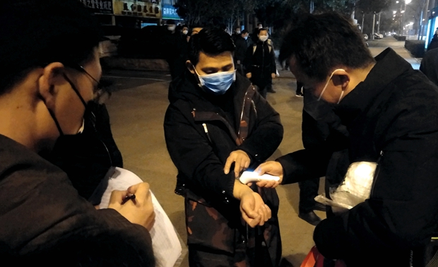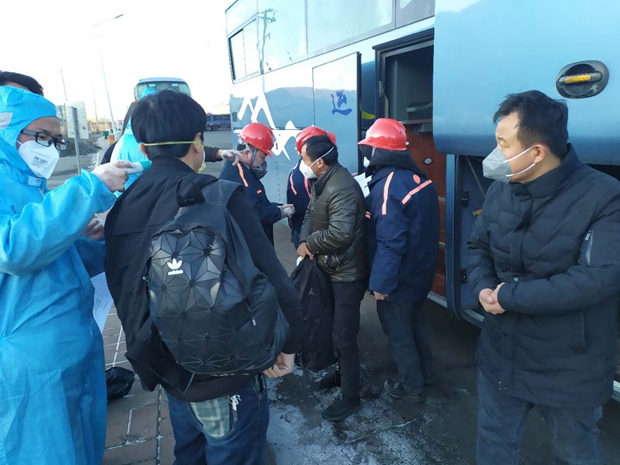 (2月13日,早上5點40時,淮北市,工作人員在為即將“出征”的職工檢測體溫)