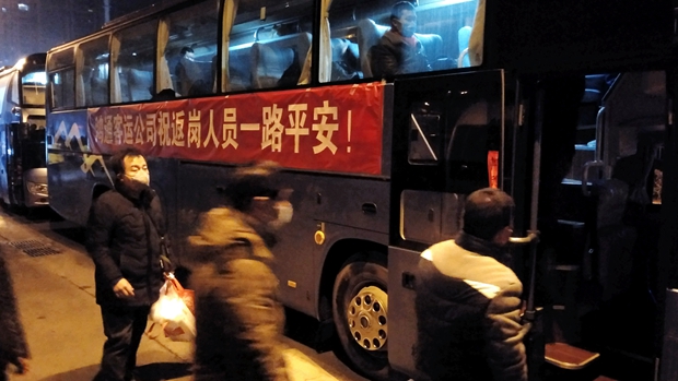 (2月13日,早上5點50時,淮北市,職工們有序登車)