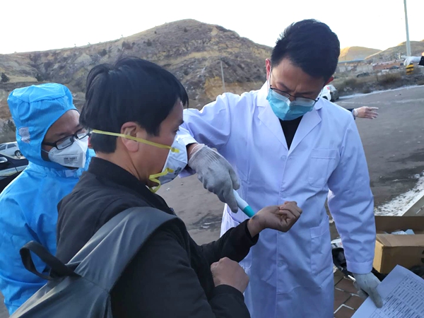 (2月14日,上午8點40分,鄂爾多斯市,范家村項目部防疫人員在為到崗職工檢測體溫)