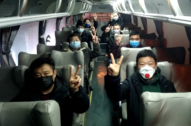(2月13日,早上6點,淮北市,即將“出征”的職工們在客車內(nèi)打出勝利手勢互相加油鼓勵)