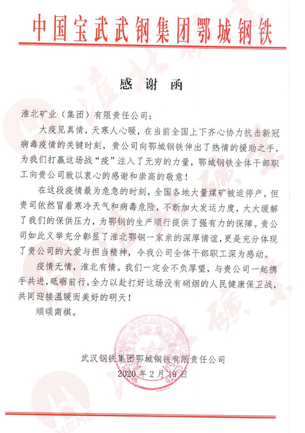 “大疫見真情,天寒人心暖,在當(dāng)前全國(guó)上下齊心協(xié)力抗擊新冠病毒疫情的關(guān)鍵時(shí)刻,貴公司向鄂城鋼鐵伸出了熱情的援助之手,為我們打贏這場(chǎng)戰(zhàn)‘疫’注入了無窮的力量,鄂城鋼鐵全體干部職工向貴公司致以衷心的感謝和崇高的敬意!”……連日來,淮北礦業(yè)集團(tuán)陸續(xù)收到武漢鄂城鋼鐵、山東鋼鐵、馬鞍山鋼鐵、南京鋼鐵、方大特鋼、蕪湖新興鑄管、中信泰富特鋼、湖南華菱鋼鐵八家企業(yè)的來信來函,感謝淮北礦業(yè)集團(tuán)在疫情防控期間給予他們強(qiáng)有力的精煤支持和保障。
