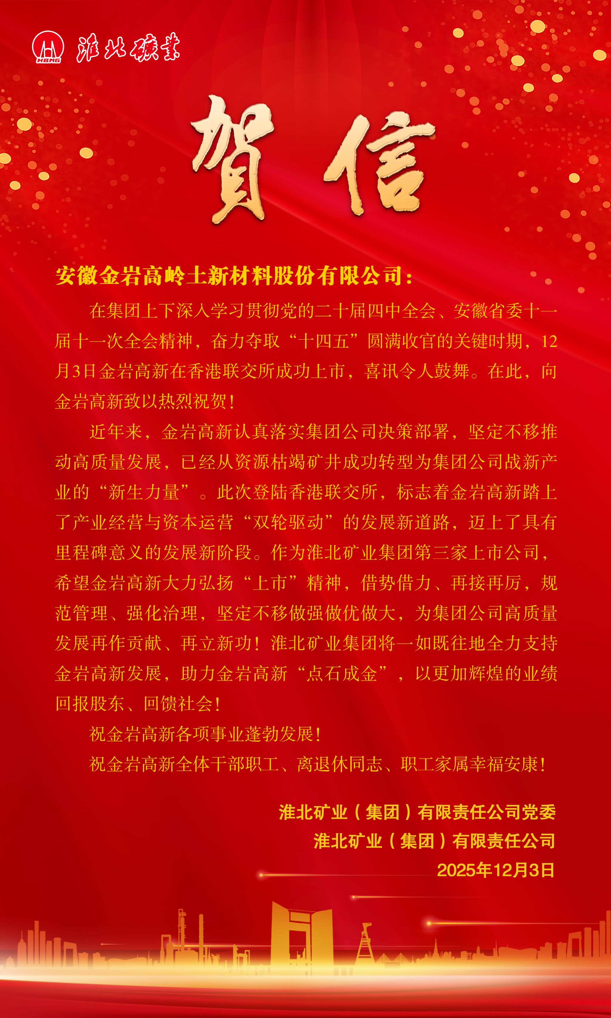 【賀信】淮北礦業(yè)集團給金巖高新上市的賀信