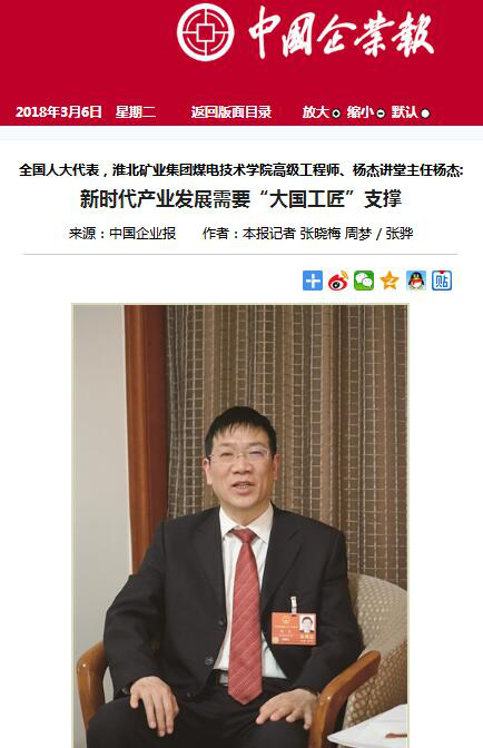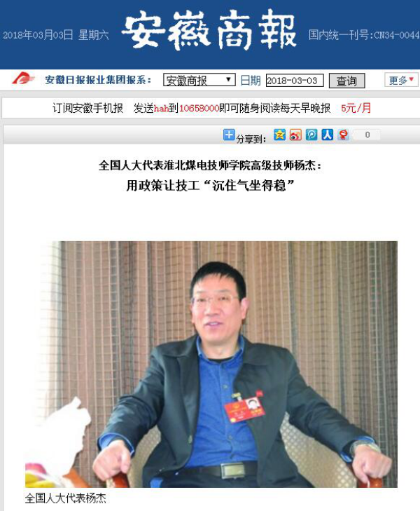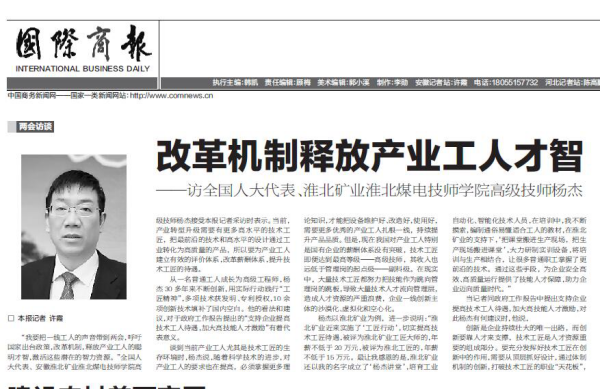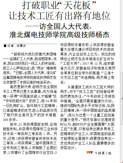 《安徽商報(bào)》3版:全國(guó)人大代表淮北煤電技師學(xué)院高級(jí)技師楊杰:用政策讓技工“沉住氣坐得穩(wěn)”