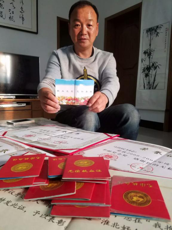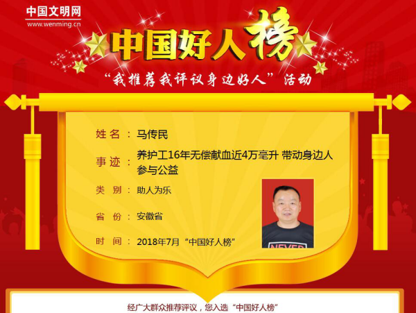 “人的生命有限,但在有限的生命里捐獻(xiàn)出血液,挽救其他人的生命,很有意義?!?002年2月14日,馬傳民到市區(qū)辦事時(shí),看到路邊停著一輛采血車,車身上的“無償獻(xiàn)血、無尚光榮”八個(gè)字瞬間吸引了他。懷著好奇的心理,他登上采血車,完成了人生的第一次捐獻(xiàn)。當(dāng)天,他領(lǐng)到了《獻(xiàn)血證》,心底的自豪感油然而生,從此開始每年定期獻(xiàn)血兩次,雷打不動(dòng)。16年間,他無償獻(xiàn)血38200毫升,其中機(jī)采血小板達(dá)到103個(gè)治療量,獻(xiàn)出的全血和血小板是他全身血液的10倍。先后三次榮獲國家無償獻(xiàn)血奉獻(xiàn)獎(jiǎng)金獎(jiǎng)、安徽省2015年度“獻(xiàn)血公益之星”、2018年“安徽好人”、第五屆淮北市道德模范、“淮北好人”、淮北礦業(yè)2017年精神文明好人好事等榮譽(yù)稱號(hào),大大小小的榮譽(yù)證書和16本鮮紅的獻(xiàn)血證差不多鋪滿整張桌面。