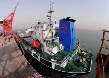 圖為2.8萬(wàn)噸級(jí)“淮潤(rùn)1”輪在連云港港口首航成功。(陳幫干 攝)