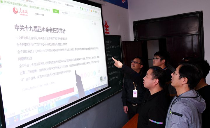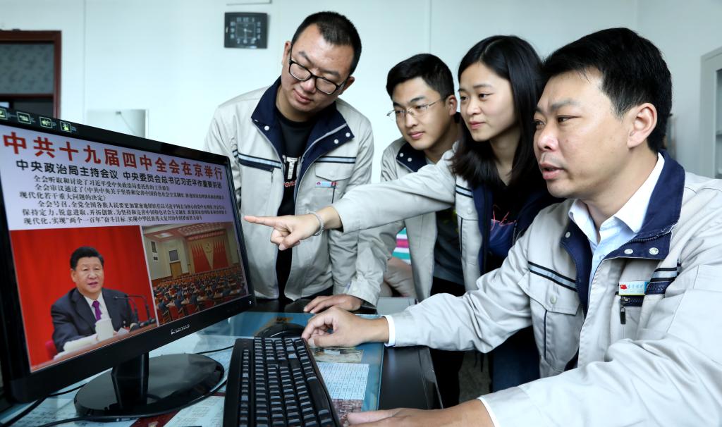 11月1日,童亭礦黨群工作部人員通過電腦、手機客戶端觀看中國共產(chǎn)黨第十九屆中央委員會第四次全體會議公報。(高加林 攝)