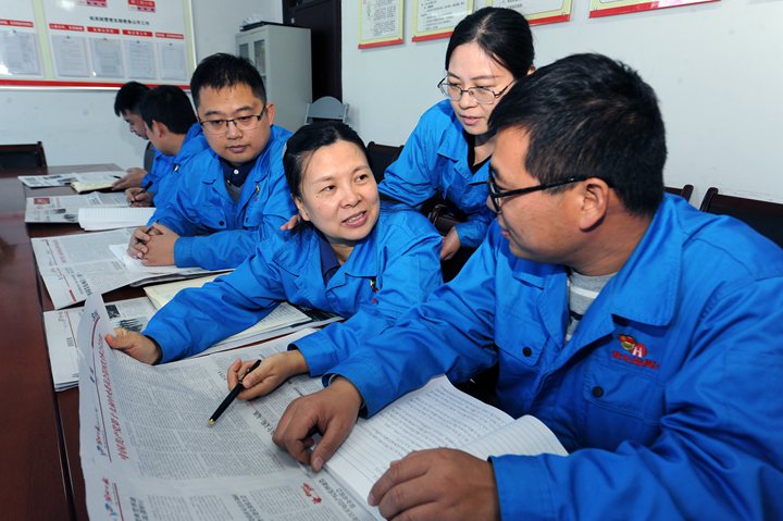 11月1日,朱莊煤礦綜掘一區(qū)職工正在學習黨的十九屆四中全會精神。中國共產(chǎn)黨第十九屆中央委員會第四次全體會議公報發(fā)布后,該礦立即組織干部職工利用廣播、電視、網(wǎng)絡(luò)等媒體進行學習宣傳。(張宗風 攝)