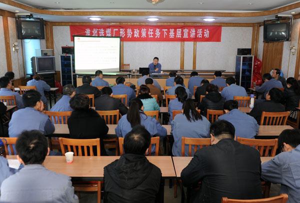 宣講透。該廠建立了廠、車間、班組三級宣傳網(wǎng)絡,以基層為主,以黨員干部、班組長為重點,采取上下結(jié)合、點面結(jié)合、集中與分散相結(jié)合的方法,形成了廠領導、車間負責人、班段長層層宣講的格局。組成宣講團深入生產(chǎn)區(qū),開展了9場宣講會,利用多媒體課件,圖文并茂、提綱挾領地給干部職工宣傳灌輸。從當前國際國內(nèi)煤炭市場形勢到集團公司轉(zhuǎn)型升級發(fā)展,從“聚焦雙效”推進改革創(chuàng)新到突出抓好安全生產(chǎn)經(jīng)營管理,從盤活人力資源到穩(wěn)增長保收入,把當前面對的嚴峻形勢與任務目標一一查擺,有針對性地解答職工群眾熱點、難點、疑點問題,做到把形勢講透,把任務講明,把思路理清,讓職工既感到壓力,又堅定了信心。