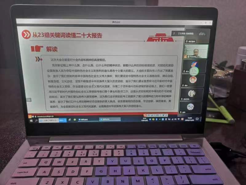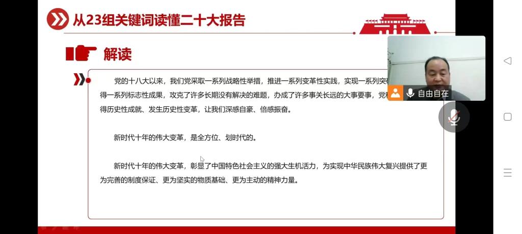 “今天,我與大家分享的是黨的二十大報告關(guān)鍵詞。大會的主題是高舉中國特色社會主義偉大旗幟……”日前,相王健康副總經(jīng)理方興強通過騰訊會議線上視頻連線方式,為黨員干部職工作黨的二十大精神宣講。宣講聚焦黨的二十大報告關(guān)鍵詞,用鮮活的事例、平白的語言,分享黨的二十大報告學(xué)習(xí)感悟,交流學(xué)習(xí)經(jīng)驗。大家在線上積極互動,談感受、談收獲、談信心,凝聚了共同奮進的強大合力。