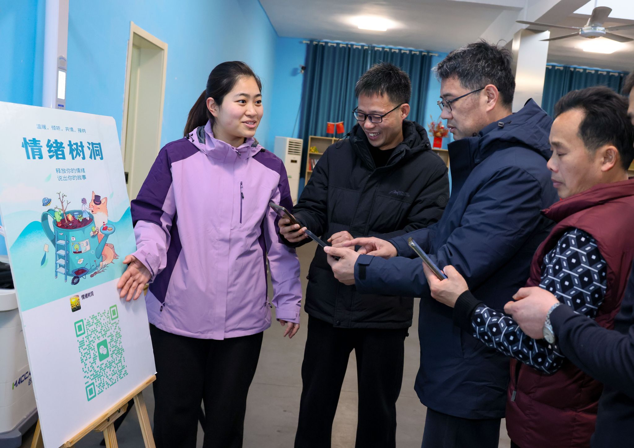 1月30日,礦心理咨詢員正在向職工介紹“情緒樹洞”微信號,鼓勵大家通過這個溫暖、安全的渠道說出自己的故事,釋放情緒壓力。